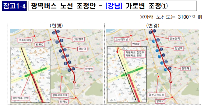 양재에서 회차하여 강남대로를 왕복으로 운행하는 9개 노선 3100번, 9500번, 9501번, 9802번, M4712번, 9700번, 6427번, M6427번, G7426은 강남대로 하행구간에서 하차승객만 있는점을 고려하여 2호선 강남역(중) 정류장부터 가로변으로 전환합니다.